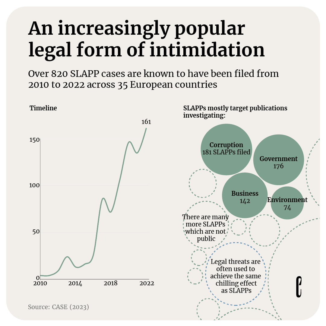 SLAPPs are increasingly used across Europe to financially and emotionally drain journalists into submission, with an increase from 570 cases in 2022 to over 820 cases in 2023. The median value of damages claimed is €15,150.